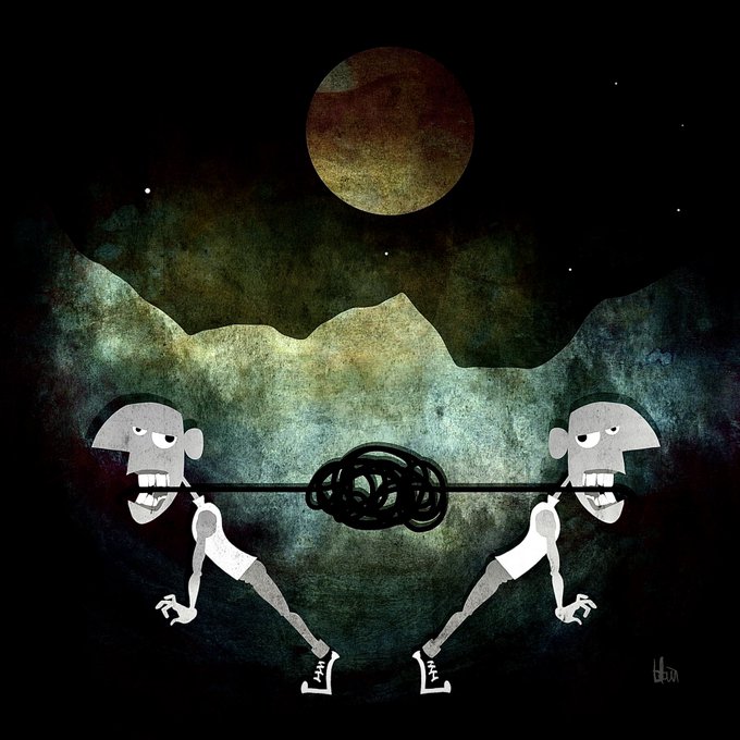 KNOT by gauntt INKTOBER 2021 DAY 4 #knot #struggle #tugofwar #mythology #unravel #moon #night #straining #conflict #bygauntt #inktober2021 #inktober #graphicdesign #cartoons #illo