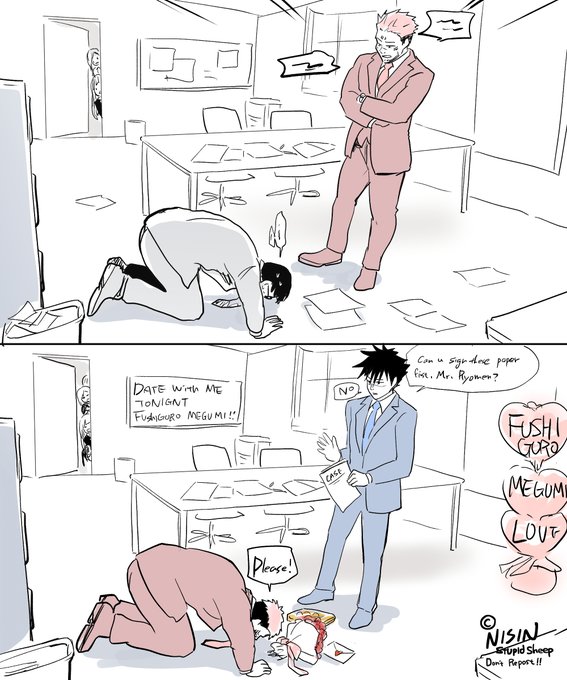 #宿伏 現代辦公室paro,那個鬼一樣的少董也有跟人下跪的一天。 然而伏黑惠只希望他快點把文件簽一簽放他回去工作。 有參考 ∆ Don’t REPOST、禁止轉載 【工商】宿伏同人誌:linktr.ee/nisinsheep #sukufushi