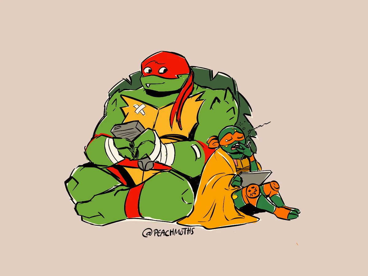 The baby brother is cute and all but bro needs to find a better place to nap Raph has places to be #rottmnt #rottmntfanart #tmnt #sunsetduo