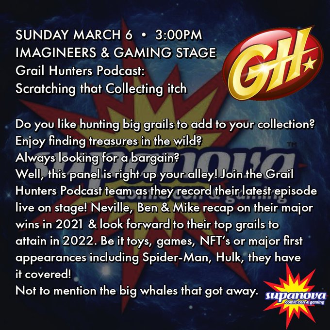 SUPANOVA EXPO DAY 2 | TODAY! If you're heading to Supanova Melbourne, please come hang out with me! TODAY • 3:00pm @ Imagineers & Gaming Stage Grail Hunters Live Podcast: Scratching that Collecting Itch #supanova #supanova2022 #supanovaexpo #supanovamelbourne #cosplay