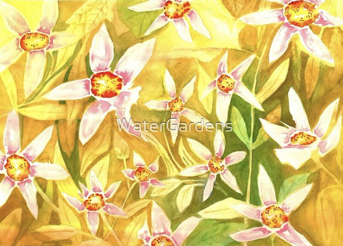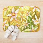My "Garden of Eden" watercolour is on lots of stuff in my #Redbubble shop tinyurl.com/3r79345u Read ALT for product details #Flowers #Floral #FloralPrint #Yellow #GiftIdeas #NatureLovers #SupportSmallBusiness #IndependentArtist #Bathroom #ShowerCurtain #Bathmat #Decor #Home
