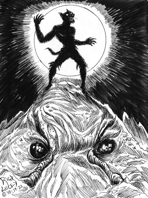 Day 19 of #Rinktober, #Drawlloween, #drawtober and #WereWolfWednesday ! Chills and welcome to #Halloween time! #sketchbook #drawing #horror #surrealhorror #drawrick #inksketch #halloweenart #werewolf Werewolf in the evening and the Man Mountain having a scary evening! Chills!