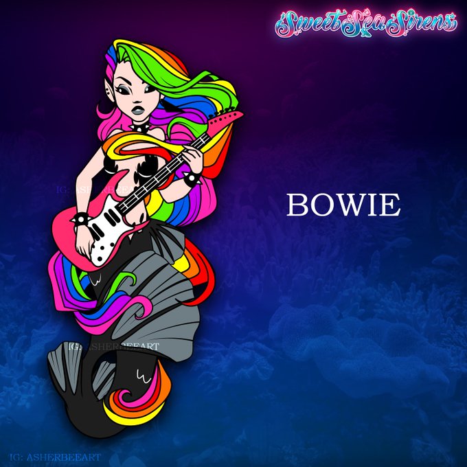 Bowie, the Rainbow RockMermaid. Ever so often, I’ll be introducing a new mermaid pin that will be a part of a new Sweet Sea Sirens Kickstarter I’m planning for May. #mermaids #mermay #rockerchick #rocknroll #metalmusic #rainbowhair #sweetseasirens #digitalart #kickstarter