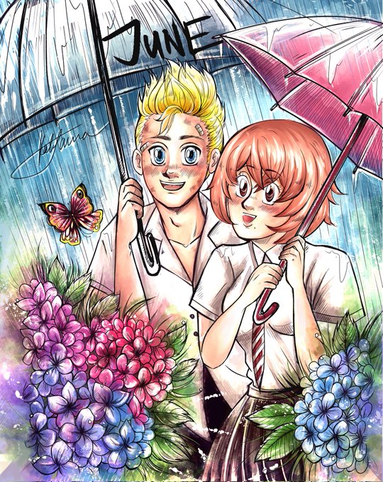 Der Juni geht zu Ende ❤️🦋 Ob @NataKaliArt gewusst hat, dass dieser Sommer so verregnet sein wird? Aber in der süßen Begleitung von Hina ist das alles nicht so schlimm 😌 #takemichi #東卍FA #takemichihanagaki #hinatatachibana #takemichifanart #takehina #trfanart #tokyorevengers