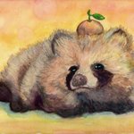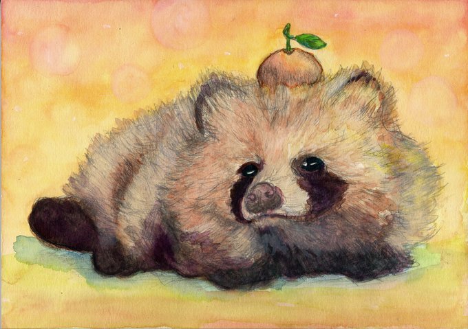 「たぬき寝入り正月」 せっかくの正月だしまどろんでいたらお父さんが頭の上にみかんを乗せていきました。 落とさないようにするのが大変で少したぬき寝入りしようかと思います。 #動物 #たぬき #racoondog #tanuki #水彩 #イラスト #イラスト好きさんと繋がりたい #絵描きさんと繋がりたい