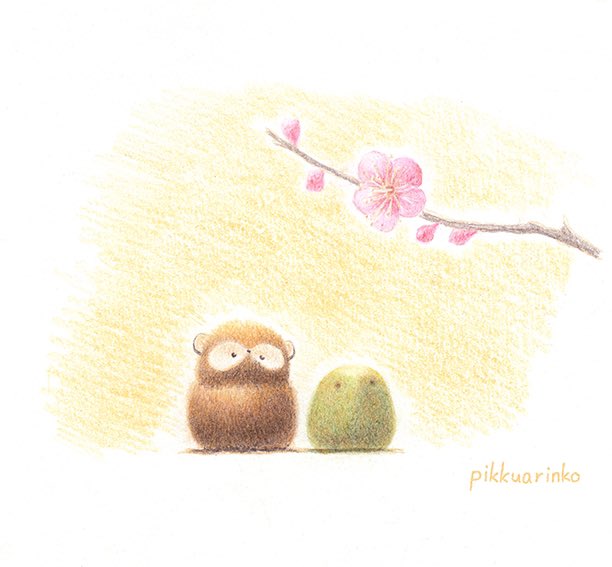 たぬきケーキさん と 春のけはい Spring is just around the corner #たぬきケーキ #たぬき #鶯餅 #梅 #tanuki #racoondog #uguisumochi #イラスト #illustration #illust #art