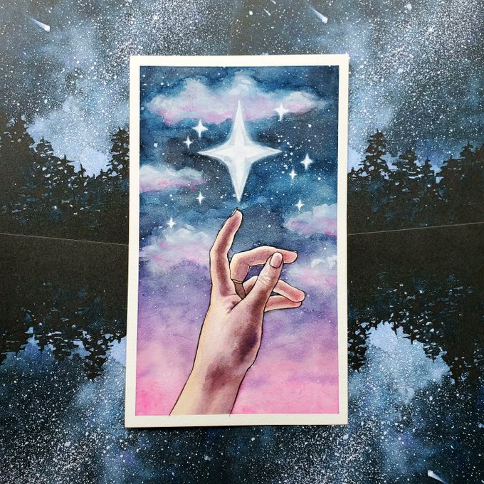 I like to think of 9 of Cups as the "Wish Card" and chose to paint 9 stars in place of cups. It symbolizes contentment, satisfaction, emotional fulfillment, and a wish come true. #Tarotcards #tarotart #art #watercolor #9ofcups