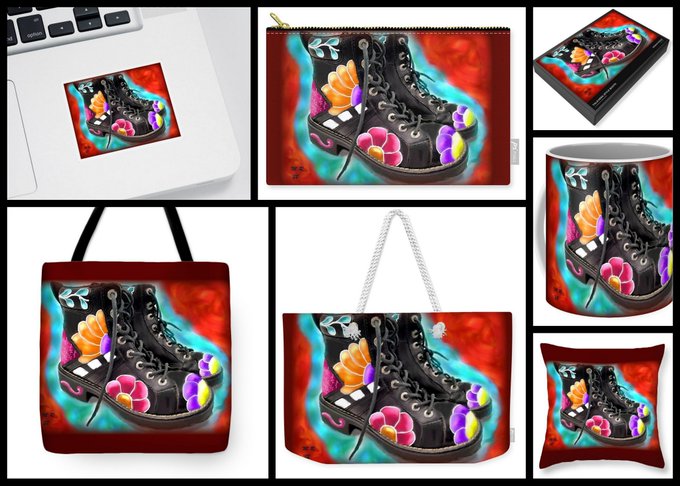 Talavera style boots printed on different products. Get it here: fineartamerica.com/featured/talav… My art shop: monica-resinger.pixels.com #buyintoart #talavera #floral #purple #pink #boots #orange #teal #SupportArtists #ArtistOnTwitter #painting #art #whimsical #colorful