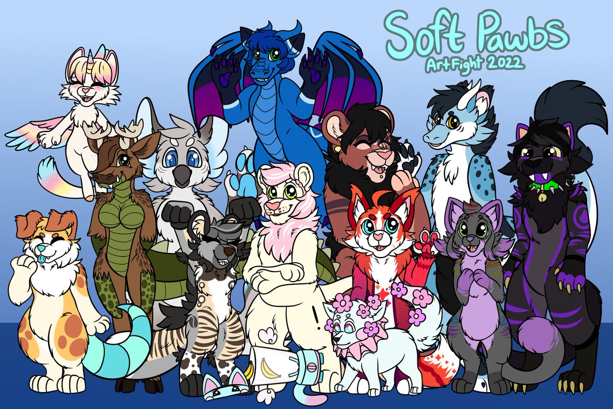 Well since #TeamBloom officially won #Artfight2022, it only feels fitting to share my big group attack on the Soft Pawbs members (the ones I could find). Was a lot of fun completing this piece, 10+hrs of work, 13 characters!
