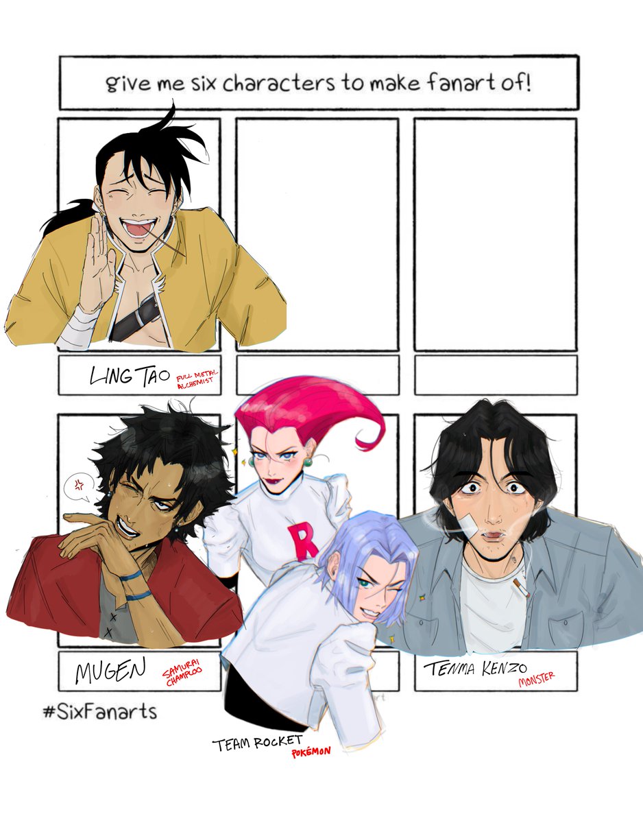 This is what I have so far since I have lost my Apple Pencil charger and still have not found it after several daaaaaays I will post the individual pieces in the thread 😭😭 #sixfanarts #fma #monster #pokemon #samuraichamploo #lingtao #mugen #tenmakenzo #TeamRocket