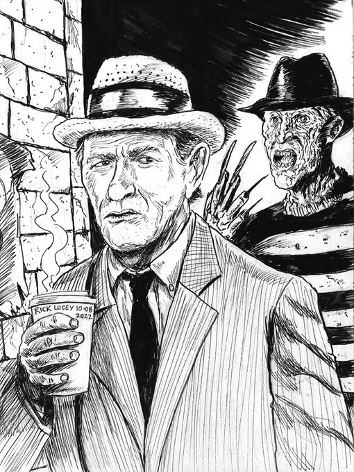 Day 08 of #Rinktober, #Drawlloween, #drawtober, etc. Carl wondered did he accidently order decaf! Chills and welcome to #Halloween time! #sketchbook #drawing #monsters #monster #surreal #nightmare #drawrick #CarlKolchak #thenightstalker #Freddy #nightmareonelmstreet