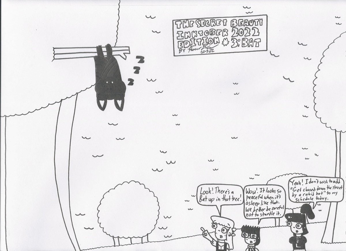 For the third #Inktober #thesecretbeautycomic entry, Jessica, Frankie and Melanie are at the park and what do they see up in a tree? A little sleepy: Bat!