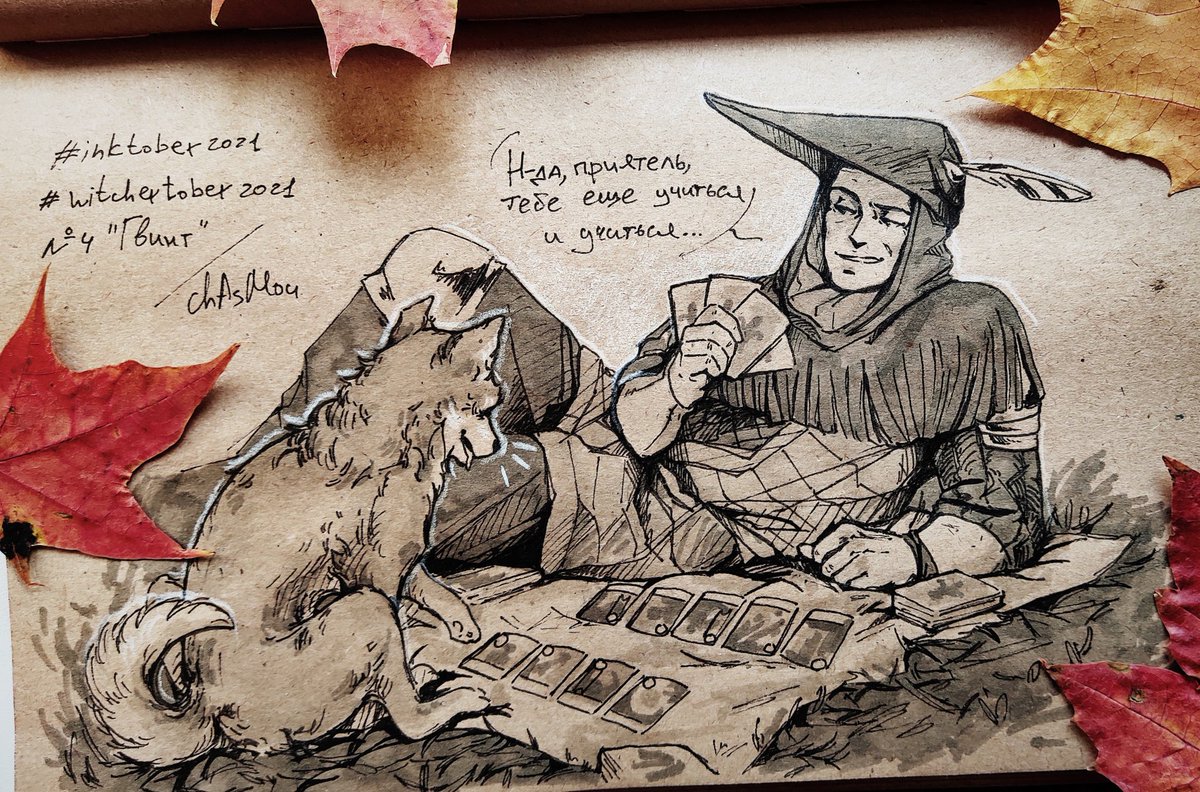 День четвёртый: "Гвинт" Собака побольше учит собаку поменьше играть в гвинт, ну разве не чудесно? #inktober2021 #inktober #witchertober2021 #Thronebreaker