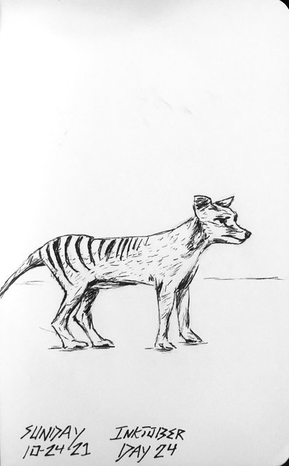 Inktober day 24, Extinct As an Australian I felt compelled to draw one of our extinct animals for this prompt, the Tasmanian tiger. #inktober2021day24 #inktoberday24 #inktober2021 #artchallenge #draw #inktober #ArtistOnTwitter #animalart #aussieart #lineart #thylacine