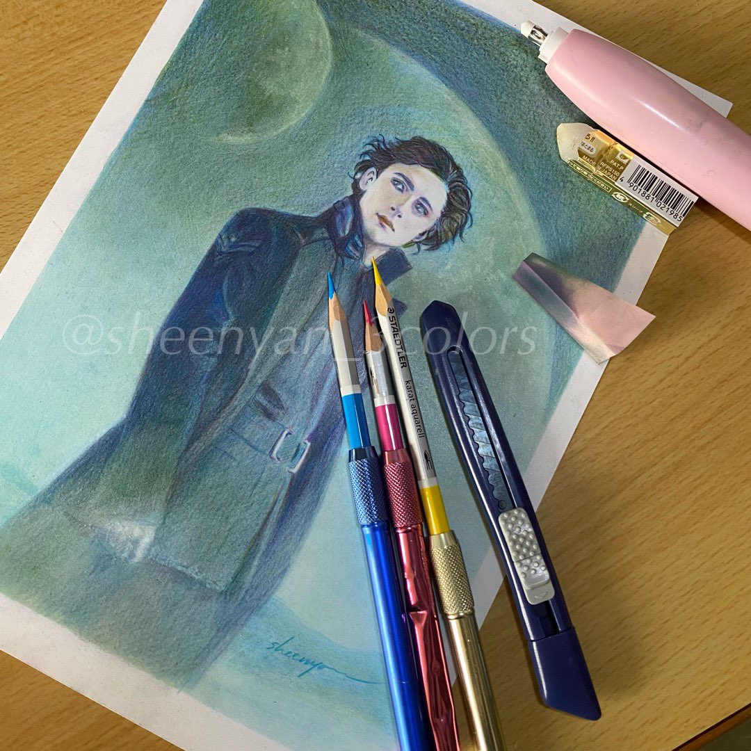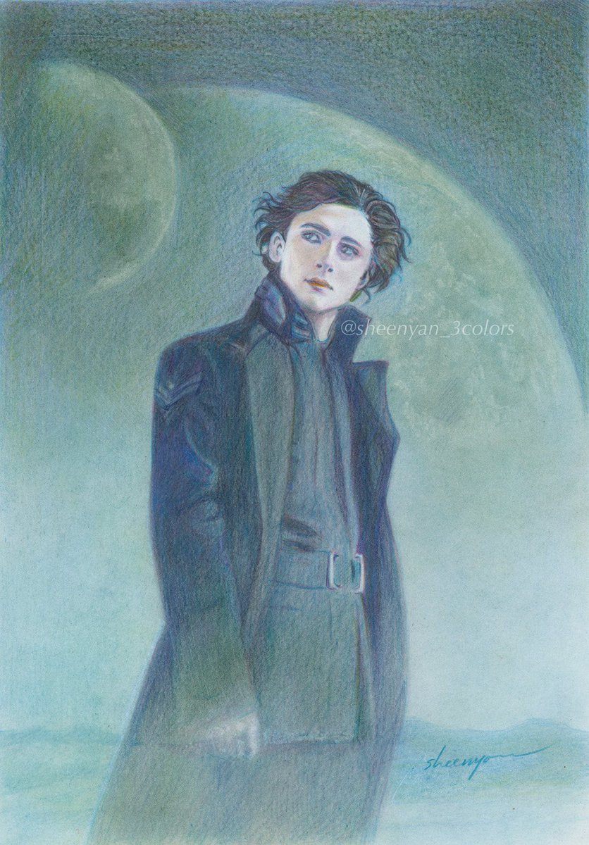 #みんなで色鉛筆イラスト見せ合おうよ 映画「DUNE」から、ティモシー・シャラメさん(@RealChalamet )描きました✨ サイズはA4ですが背景を塗るのに必死で、顔は似てません😭💦 #3色 #色鉛筆画 #DuneMovie #Dune #TimothéeChalamet #ティモシーシャラメ #似顔絵 #色鉛筆3色 #アトリエの系譜