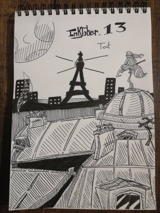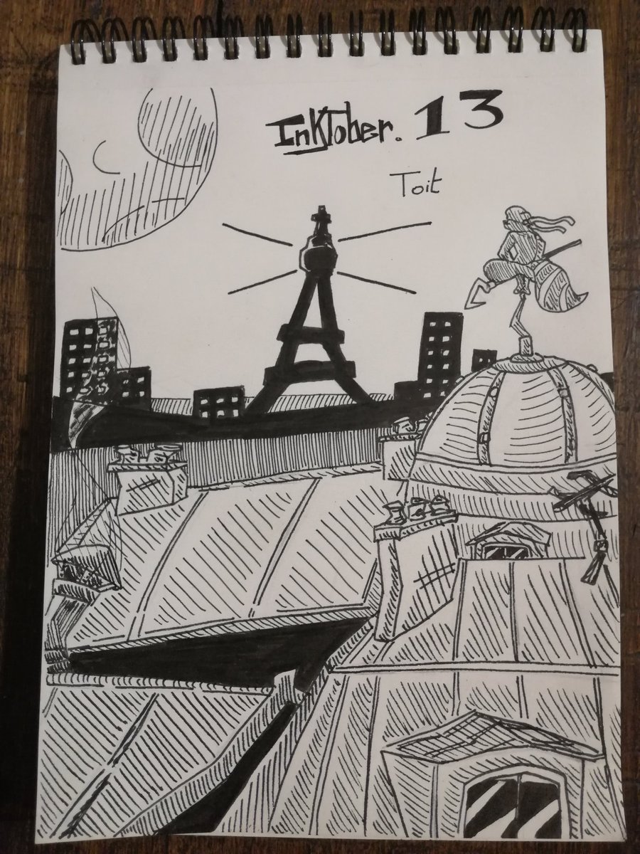 13e jour de l'Inktober Thème : Toiture. Quand je pense aux temps passés par les équipes @UbisoftMTL pour modéliser des environnements réalistes pour qu'au final, on coupe court en passant par les toits 😅 #inktober2021 #roof #toit #AssassinsCreed