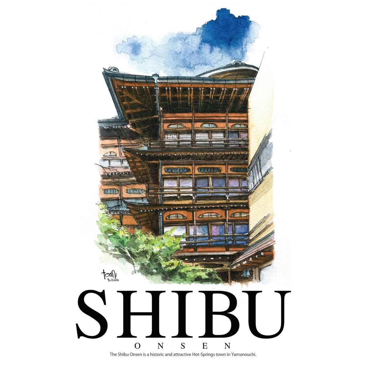 描いた渋温泉の水彩画を配したB2サイズのグラフィック作品をつくりあげた。欧文と水彩画のとり合わせは相性がぴったり。カッコイイのだ!#art #shibuonsen #渋温泉 #水彩画 #ポスター #tomitsukada