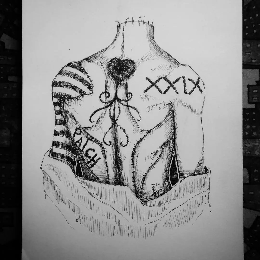Inktober Day 29 - PATCH Another one from my morbid collection! My anatomy sucks though... #inktober #inktober2021 #inktober2021day29 #inktober2021patch #blackandwhite #torso #sewing #sketchoftheday #sketch #drawing #handdrawn #traditionaldrawing #traditionalsketch #inksketch