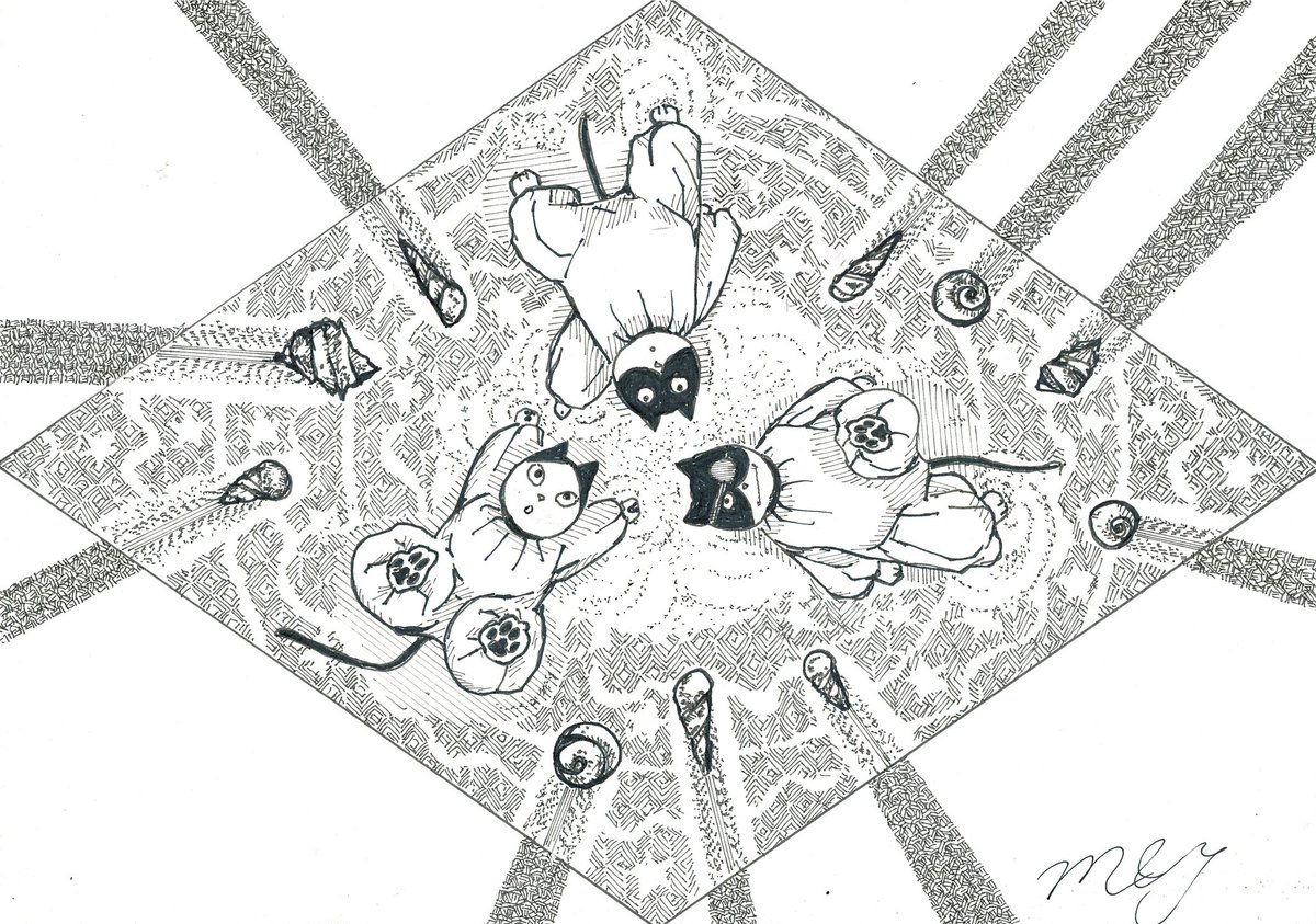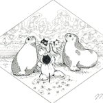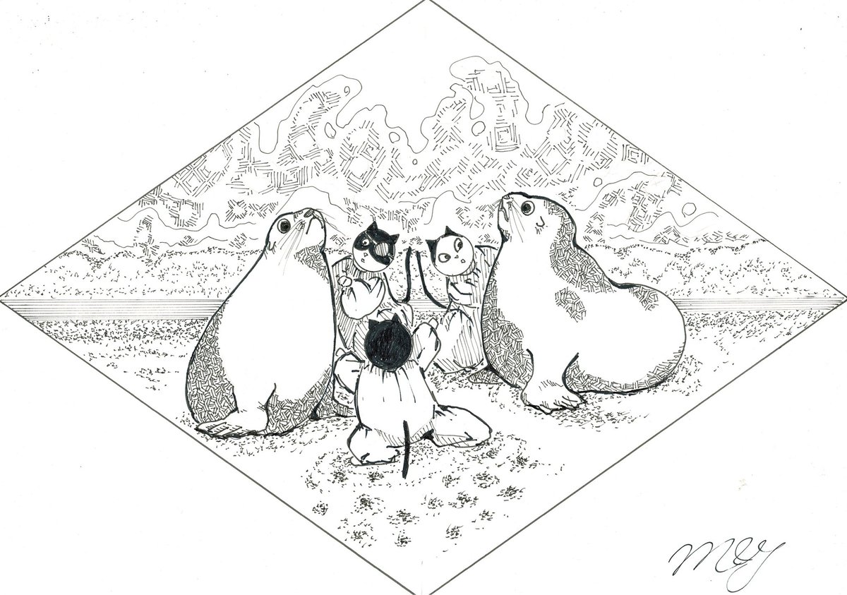 *19 archipelago* The cheerful friends and their unique acquaintances The cheerful friends have sea lion friends. They came to ask sea lions for help. Because, they wanted to know where the fish had gone. by Cacako #traditionally #art #illustration #cat #sealion