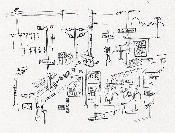 1. Quickly drawing something at each train station during my London return trip. 2. Placing my pen loosely on the page and letting the jiggles of the train guide it across the page. #trainart #ArtistOnTwitter #dailydrawing #thedailysketch