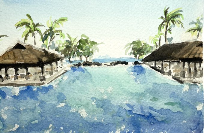 寒いので暖かい所描いてみたけど波の感じ全くでず、、、 #水彩 #水彩画 #透明水彩 #風景画 #バリ #バリ島 #お絵描き #イラスト #スケッチ #旅行 #watercolor #watercolorpainting #transparentwatercolor #landscapepainting #Bali #drawing #illustration #sketch #travel