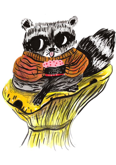 May I offer you a raccoon in these trying times? 🦝 🍄 🧁 #illustration #kidlit #kidlitart #gouachepainting #gouacheillustration #trashbandit #trashpanda
