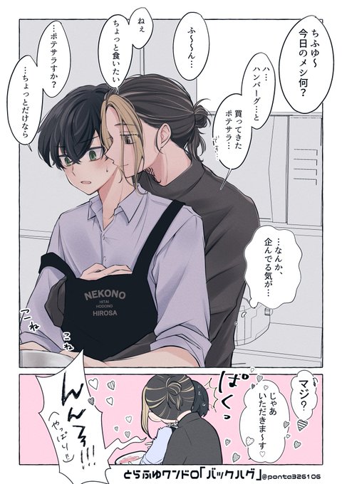 とらふゆワンドロ【バックハグ】 遅刻参加すみません🥲 +3くらい 22軸 ❄️の料理中、手が離せないタイミングを見計らってセクハラする🐯 #trfy_1dr1wr @trfy_1dr1wr