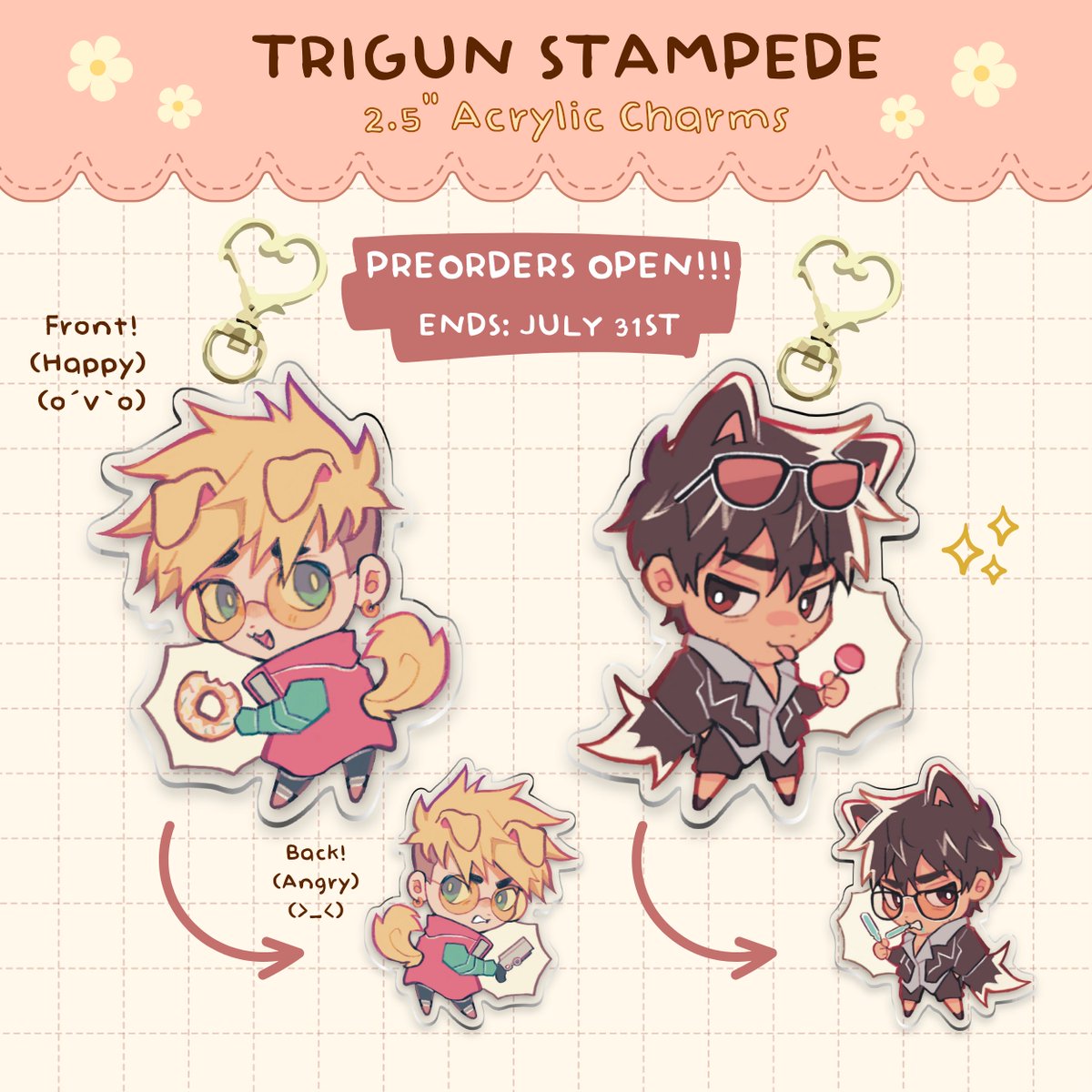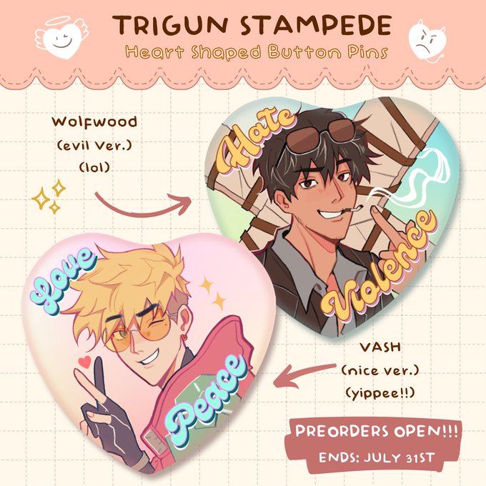 HELLO I'm making some silly tristamp/vashwood merch!! becuz i love them a lot!!!!!! :3c 🌟 Heart Shaped Badges 🌟 2.5" Acrylic Charms PREORDER (until 7/31): ✨oyinniex.bigcartel.com✨ #TRIGUNSTAMPEDE #TRIGUNイラコン