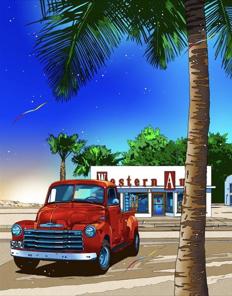 版画『砂漠は真っ赤なブルースで』 私は片意地者、新車は買わず荒野を駆け抜ける。 gallery.eizin.co.jp/?p=1495 #鈴木英人 #版画 #アート #イラストレーション #イラストレーター #アメリカ #フォード #トラック #砂漠 #eizinsuzuki #illustration #illustrator #art #America #Ford #truck #desert