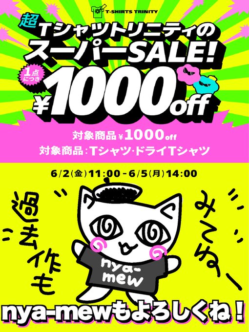 #Tシャツトリニティ #セール中 2023年6月2日(金)11:00 ~ 6月5日(月)14:00 Tシャツ・ドライTシャツ1000円OFF! nya-mewもよろしくね ttrinity.jp/shop/nya-mew/d… #猫 #子猫 #イラスト #Cats #kitten #Tshirt twitter.com/tshirtstrinity…