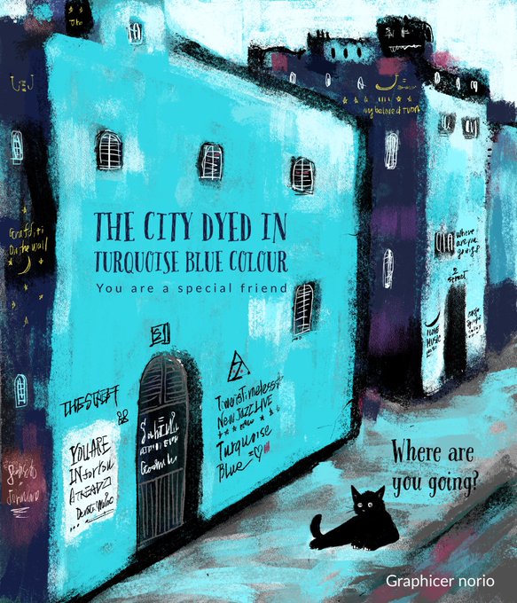ターコイズブルーに染まる街 気持ちいい色に包まれる猫 ラブソングが聞こえてくる You are a special friend #illustraion #drawing #illustraionart #picturebook #childrensbook #graphicart #graphicdesigners #catlover #turquoise #turquoiseblue