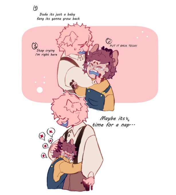 “Loose fangs” I’ve been having a bad day so—Baby Techno trying to explain to a baby Wilbur why losing baby teeth isn’t a bad thing and failing at it #twinstwt #sbifanart
