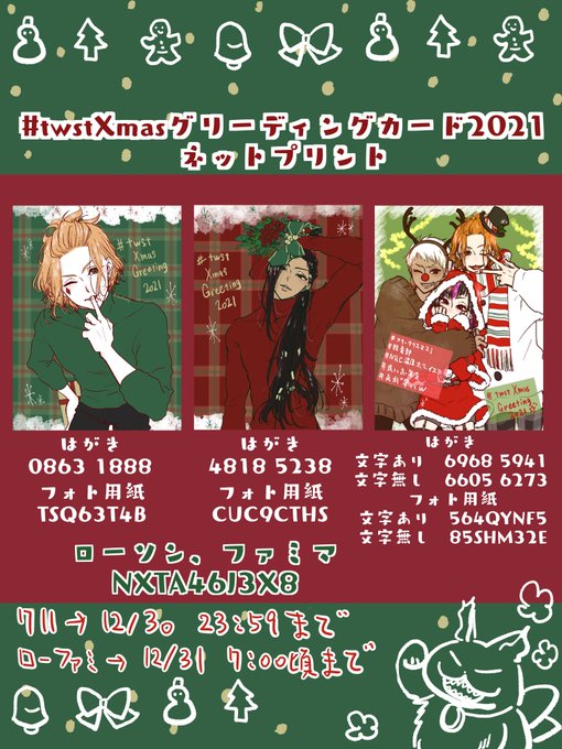 #twstXmasグリーディングカード2021 ネップリ登録しました! はがき印刷していただくとよりそれっぽいかもしれません! ローファミのみ、マロで頂いてたので少しだけ1つ前のネップリのものを再登録しました! よろしくおねがいします!👺 ローファミ→L30円/2L80円 セブン→L40円/はがき60円