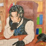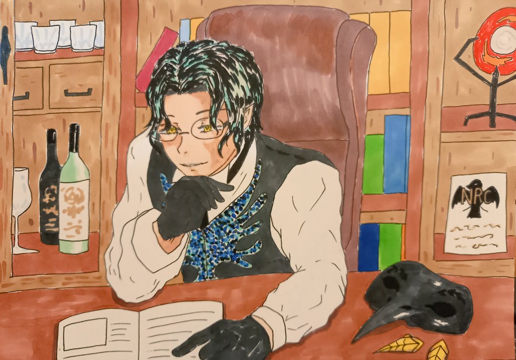 #twst_メガネ男子企画 #twstファンアート #学園長 ⚠️仮面なし素顔捏造 Halu(@Halulu_yuyume17)さんの企画に参加しました。素敵な企画をありがとうございました。 私室でくつろぐ学園長です。 「おや。いけませんねぇ。こんなところまで入ってくるなんて。」