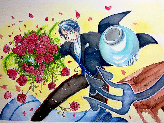 #twst_執事企画3 素敵な企画に♠️で参加させていただきました!!せっかくの飾り付けも、イタズラ好きには格好の餌食です。 透明水彩、アクリルガッシュ、紙はアルシュの細目。 ↑の執事企画タグから他の参加者様の素敵な執事作品をご覧いただけます! #twstファンアート