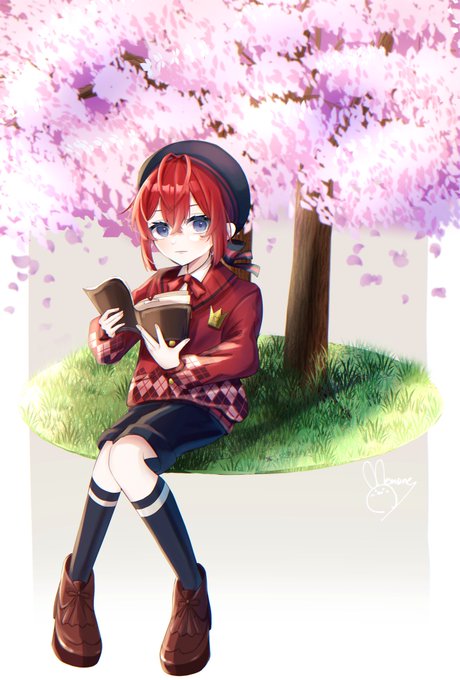 #twst_桜のベレー帽ショタ ⚠︎年齢操作 憧れの人の石像の下で勉強していたらうとうとしてきて‥🔔 えと様の素敵な企画にロロで参加させていただきました‥‼︎ タグから可愛い子がたくさん見られますので是非🌸 #twstファンアート