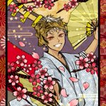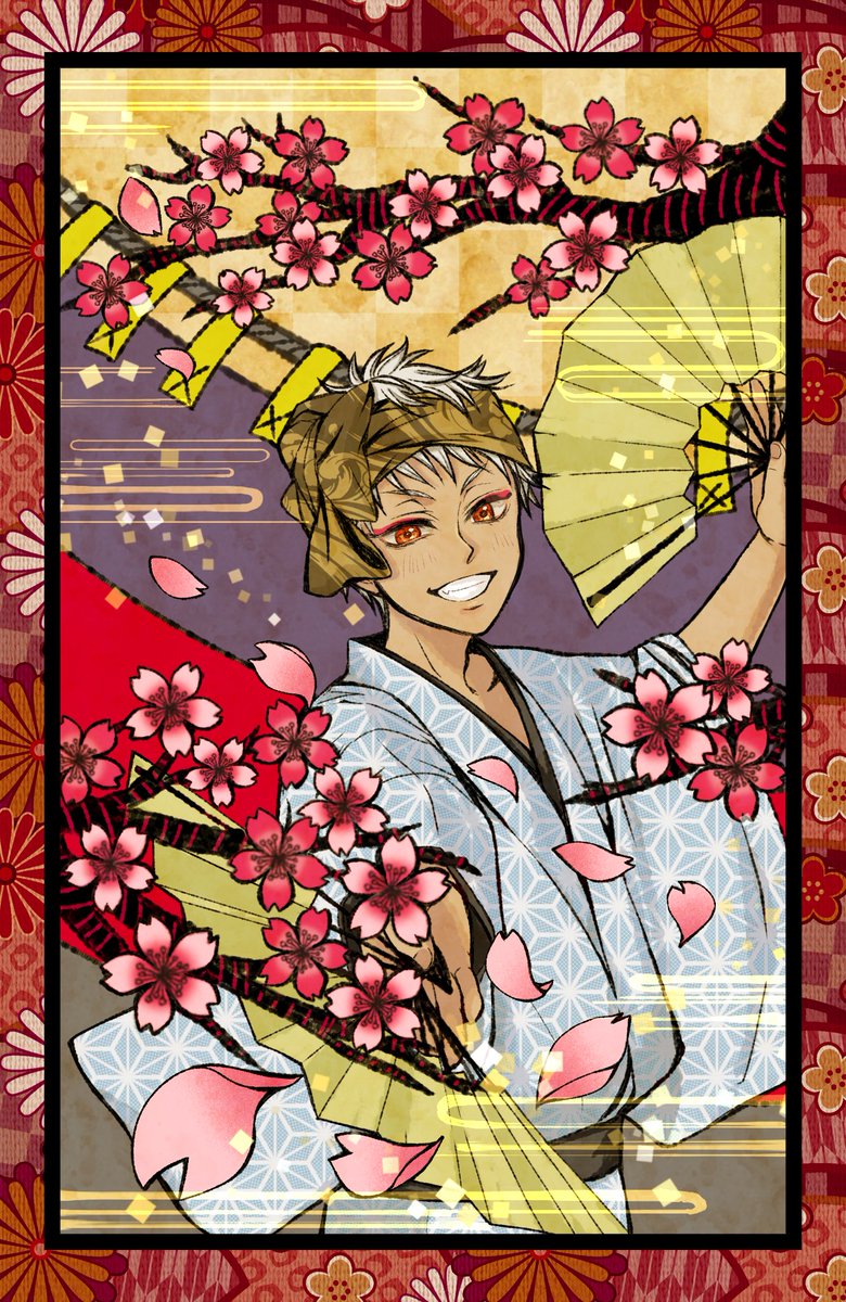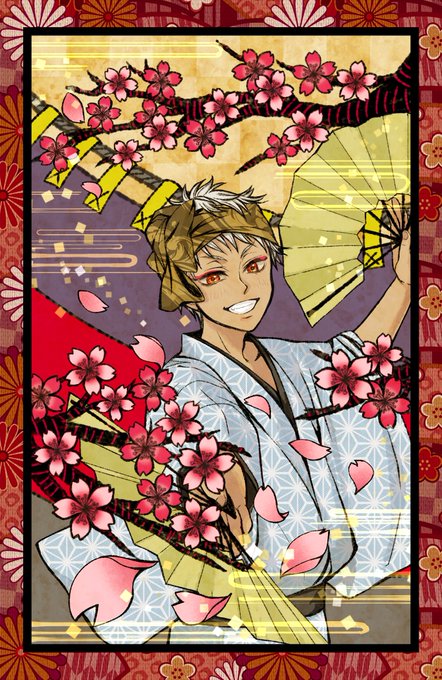 #twst_花札企画_ 海月さんの素敵な企画に参加させていただきました🙇 1枚目 🎴「桜に幕」でカリム🥥です 宴が好きなカリムくん…お花見を楽しんでいて、舞を披露してくれているイメージで描きました😊 #ツイステファンアート #twstファンアート