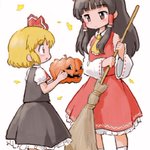 「人間にこれをかぶせて妖怪のなかまにする日だって聞いたよ」 「仲間にしたいんだったら落ち葉かき手伝ってよ」 #ルーミア #博麗霊夢 #東方project #txb6 #毎月七日はルーミアの日 大遅刻からの今日はハロウィン