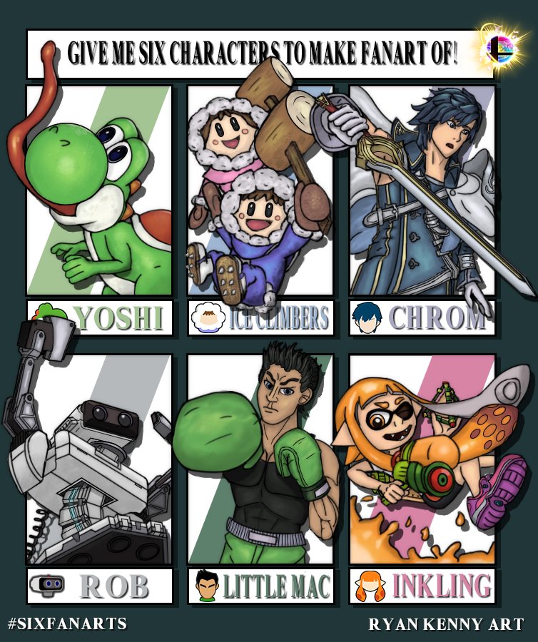 Took me a while but here's my #Sixfanarts submission! I asked my sister to give me #SuperSmashBrosUltimate characters and this was a lot of fun to do! :) #Smash #SmashBros #Ultimate #Nintendo #Yoshi #IceClimbers #Chrom #ROB #LittleMac #Inkling #Mario #NES #FireEmblem #Splatoon