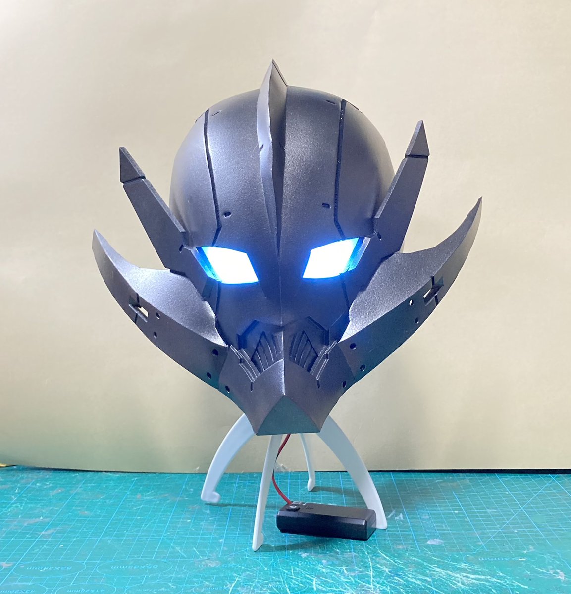 始まりの敵ベムラー 頭完成〜♪ LEDギミック仕込んで、視界確保してなんとか装着出来たのでヨシ! 色は絶対ガンメタにしたかったw あえてツヤは抑え気味。テカテカはちょっと違う気がして… 2、3日クオリティの割には満足(^^) #ultramanコスプレ