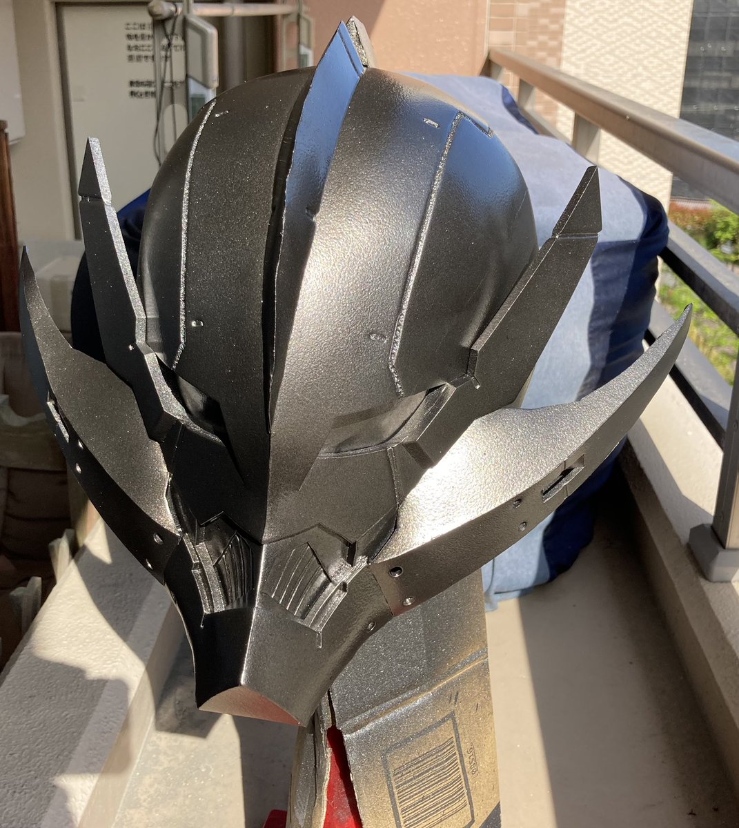 塗装はいつものAZラバースプレー 最初にベースとして黒を2〜3回重ね塗りしてからシルバーを吹いて仕上げにガンメタ。 先にシルバー吹くのはガンメタだけど暗くなりがちなので、ガンメタを軽く重ねて行く感じで好みの色合いにしてます。 #ultramanコスプレ