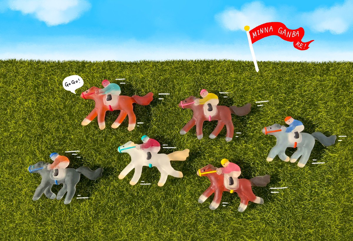 #umajominne @umajo_jra UMAJO×minneのコンテストに応募させて頂きます🙇🏻 お菓子みたいな競走馬とジョッキーさん達です🏇🏇🏇 粘土で原型を作って、レジンを流して作りました🍀表面はサラサラです☺️🍬 走っているお馬さん達はとても美しくてかっこいいです🐴✨ みんながんばれ〜!