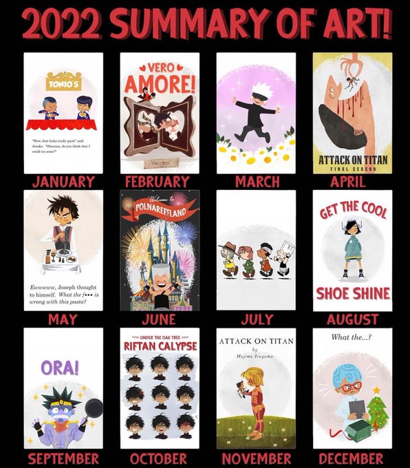 My summary of art for 2022 🙂 This year was lots of fun ❤️ . #JoJosBizarreAdventure #jojo_anime #jjbafanart #JujutsuKaisen #AttackOnTitan #gorillaz #undertheoaktree #artshare #ArtistOnTwitter #JosephJoestar #GojoSatoru #josuke #riftancalypse #polnareff