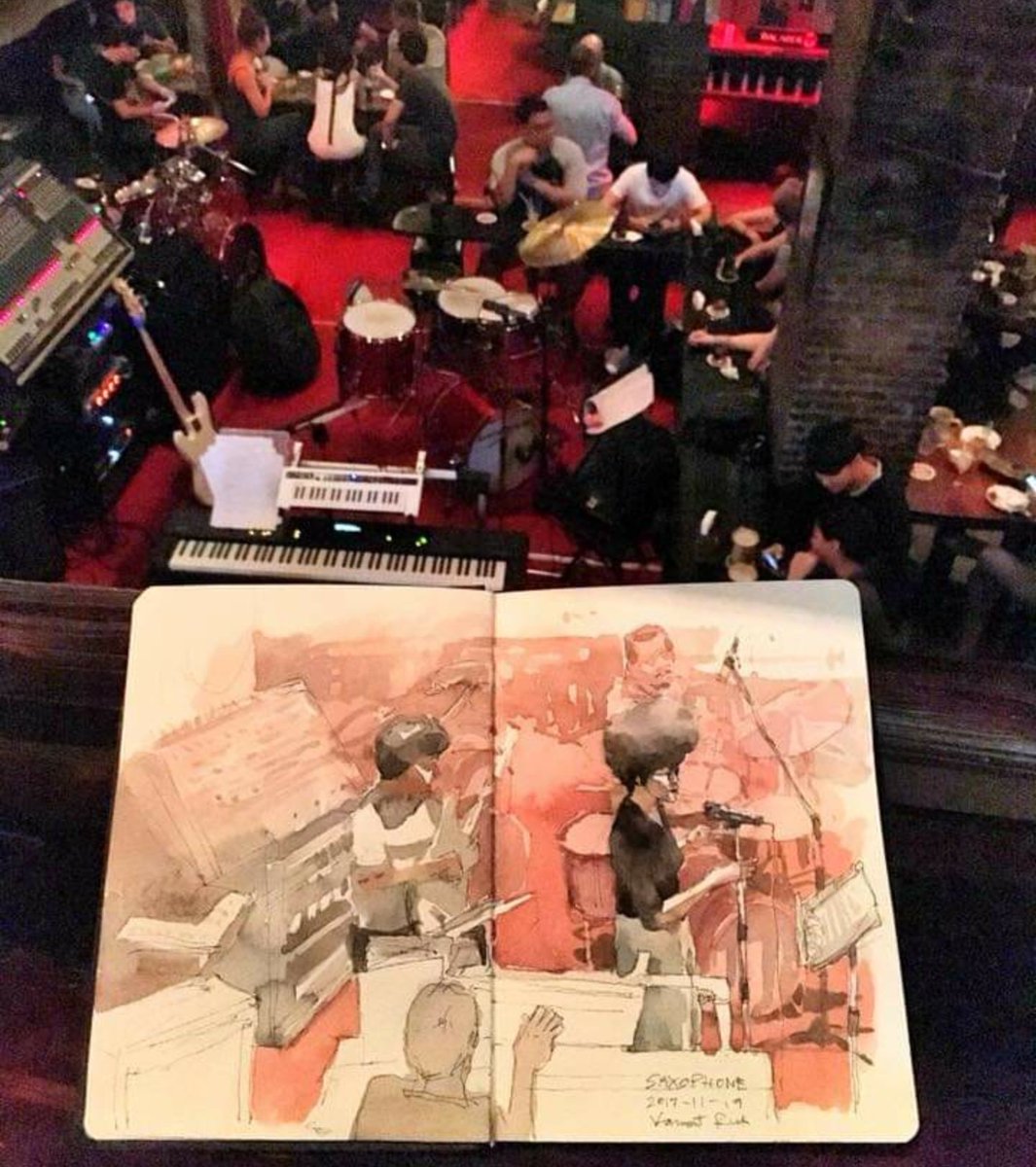 ขั้นสุดแห่งความฟินในการ Urban sketching คือการจิบเบียร์ไป ฟังแจ๊สไป วาดรูปไป แต่แนะนำว่าอย่าหาทำเพราะในผับแจ๊สมันมืดมากกว่าจะวาดเสร็จเพ่งจนแทบตาบอด แต่ดีที่เพลงนึงเล่นกันเกิน 10 น.เลยวาดนานได้ 55 ให้เดาครับว่านี่คือผับแจ๊สที่ไหน :) #sketchbook #sketch #UrbanSketchers #Watercolor