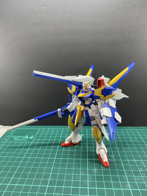 HGV2アサルトバスターです ガイアカラーのシャンパンゴールドの色が気になって作成しましたが割と時間かかってしまいました。それにしてもV系はサイズも小さいですね☺️ #ガンプラ #ガンプラの画像を貼るとRTされると聞いて #V2アサルトバスター