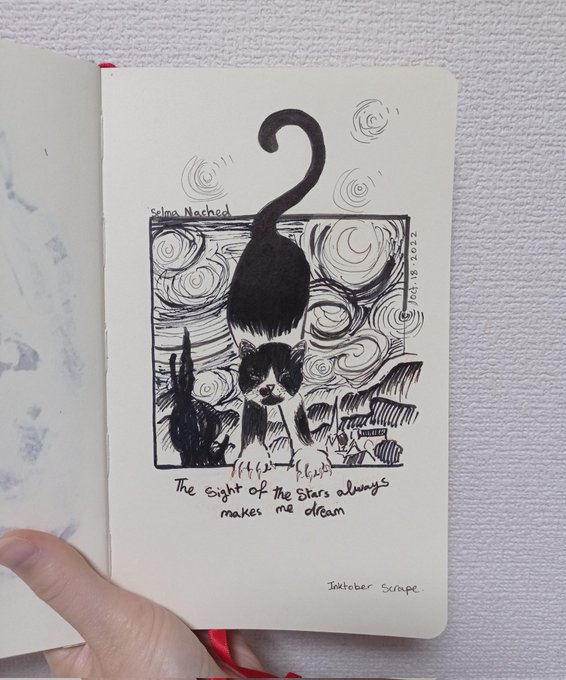 To Brightest star in my life, now in the heavens... inktober day 18 #scrape #inktober2022 #ink #vangogh #starrynight #tuxidocat #crossedtherainbowbridge🌈 #catlover #catlady #catmom #dream @inktober @jakeparker #inktoberchallenge #blackink #illustrator #illustrationartist