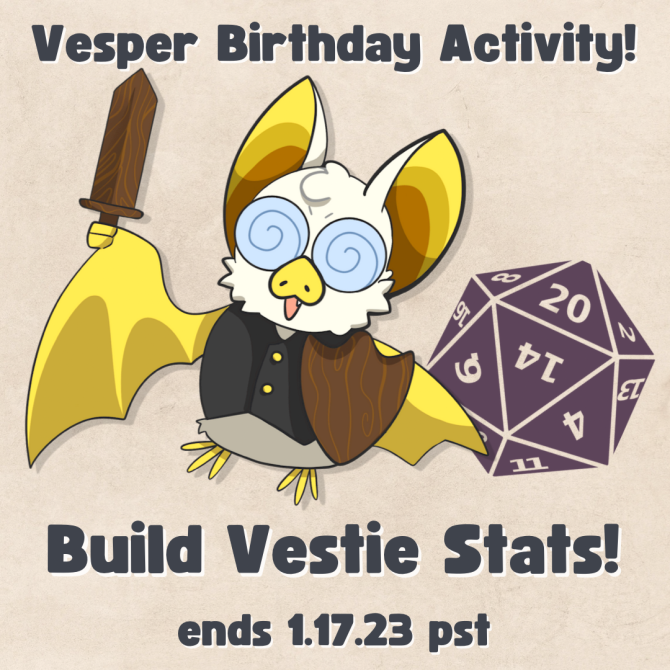 Vesties! 🦇 Final Stretch!! The final Vesper birthday gift is a Bulletin Board of Vestie Fun Facts! He wants to learn about us, so let's deliver! It's easy & short, send a (140 character) fun fact about yourself! ✉️forms.gle/Cm3FZVMbfZPvMM… #VespART #Vesfriends #VesperNoir