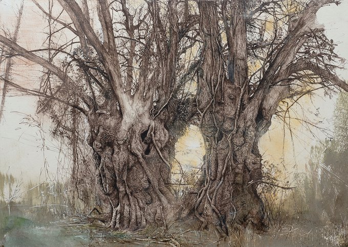 Detail of my painting 'Stumble field oak' 130 x 140cm egg tempera, watercolour, gesso #nature #landscape #englishcountryside #drawing #contemporaryart #trees #veterantrees #QGC #sothebys