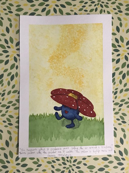 “In seasons when it produces more pollen, the air around Vileplume turns yellow with the powder as it walks. The pollen is highly toxic and causes paralysis.” #pokemon #watercolor #vileplume