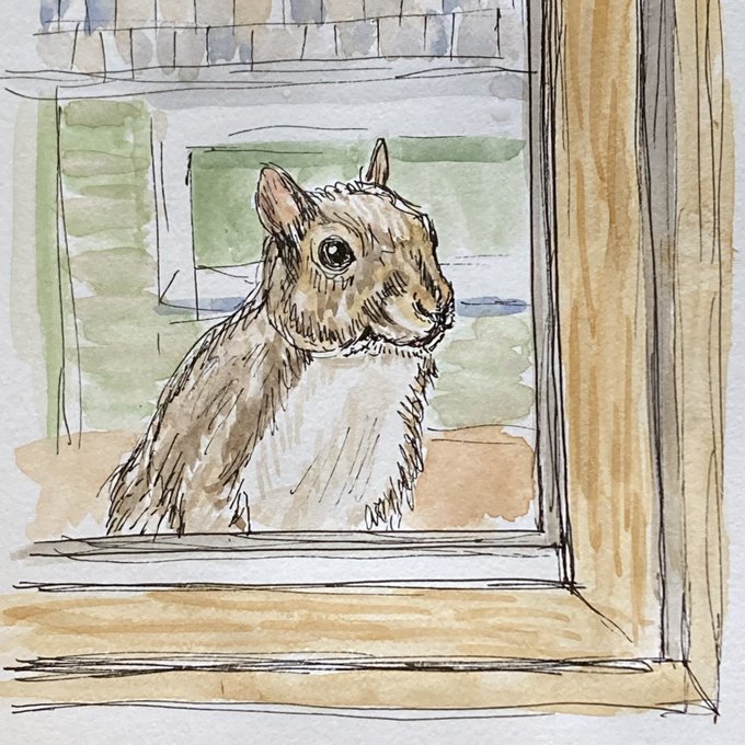 I was looking out while he was looking in and we both scared each other! #art #ink #watercolor #squirrel #outmywindow #visitor #statenisland